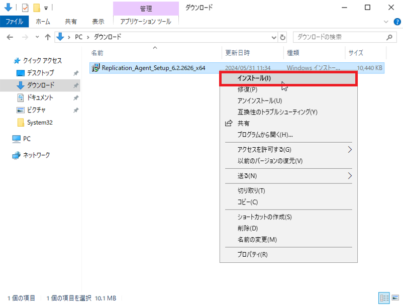 インストーラを右クリックし[インストール(I)]をクリックします。
