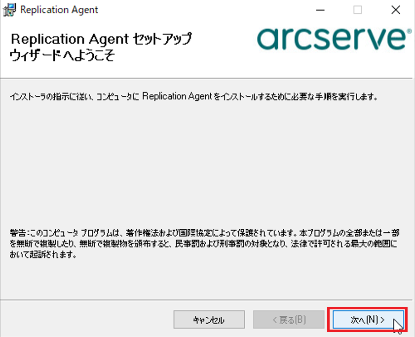 「Replication Agentセットアップウィザード」画面が表示されたら[次へ(N)]をクリックします。
