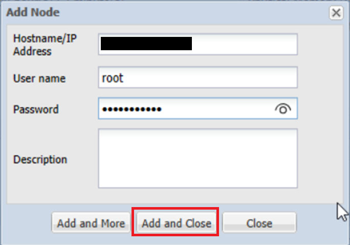 「ノードの追加」画面にて、バックアップ対象Linuxサーバ(Arcserveがインストールされたサーバ)の「ホスト名/IPアドレス」「ユーザ名」「パスワード」を入力し、「追加して終了」をクリックします。