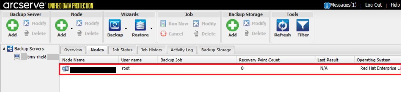 検証が終了すると元の画面に戻ります。「ノード名」タブに、バックアップ対象となるLinuxサーバのIPアドレスが追加されたことを確認します。