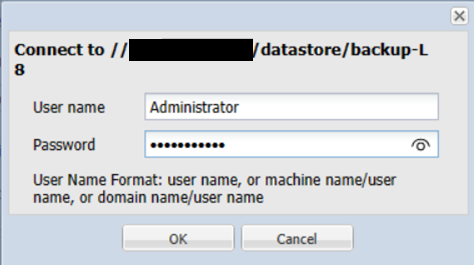 バックアップ保存先ストレージとなるCIFSサーバーの接続許可を求められるので、ユーザ名、パスワードを入力し「OK」をクリックします。