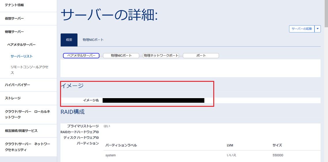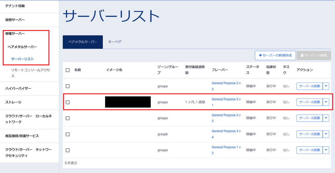 本手順では、「フレーバー:General Purpose 3 v3」「イメージ:RedHatEnterpriseLinux-8.1_64_include-license_baremetal-server_01」にてリストア先ベアメタルサーバのデプロイを行います。