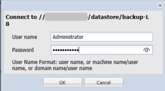 バックアップ保存先となるCIFSサーバーへの接続許可を求められるので、ユーザ名、パスワードを入力し「OK」をクリックします。