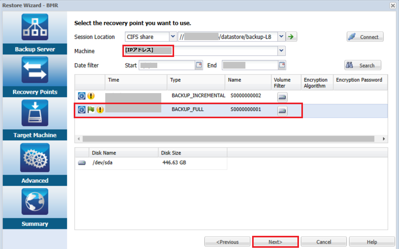 MAC/IPアドレス:リストア先ベアメタルサーバー(復旧メディア接続してISOブートしているサーバ)のIPアドレス