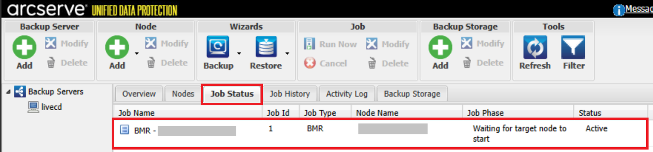 元の画面に戻り、「ジョブステータス」タブにリストアジョブが実行されたことを確認します。