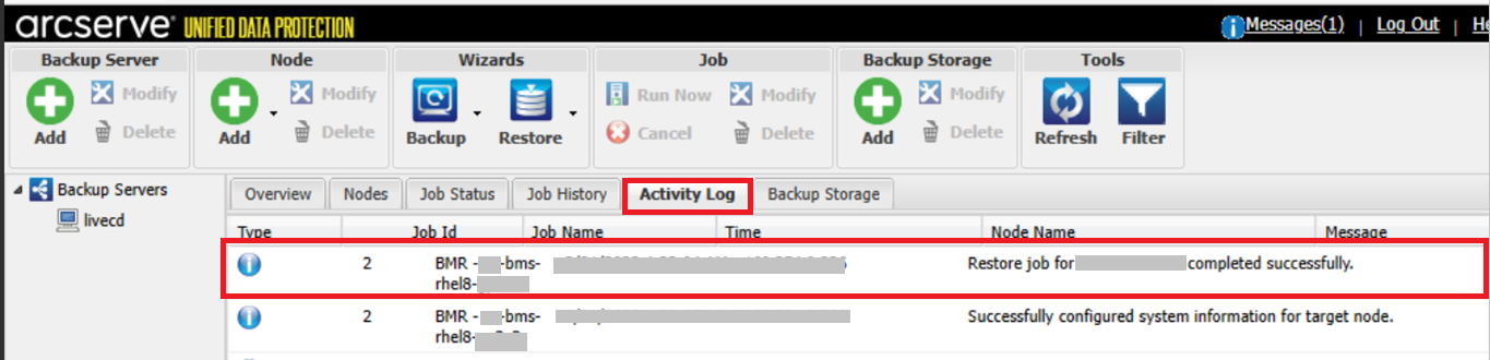 「アクティビティログ」タブにて、リストアジョブが成功したことを確認します。