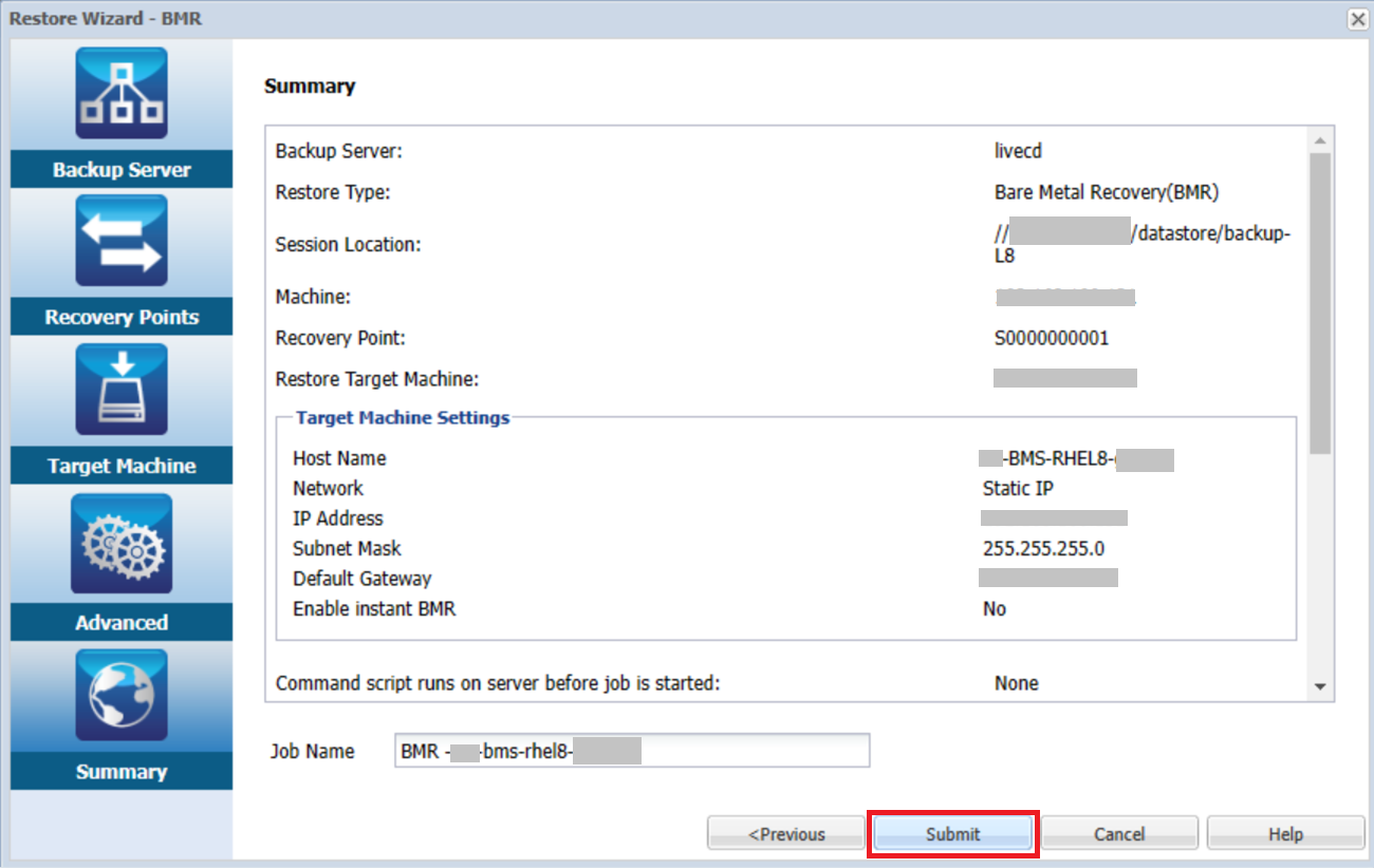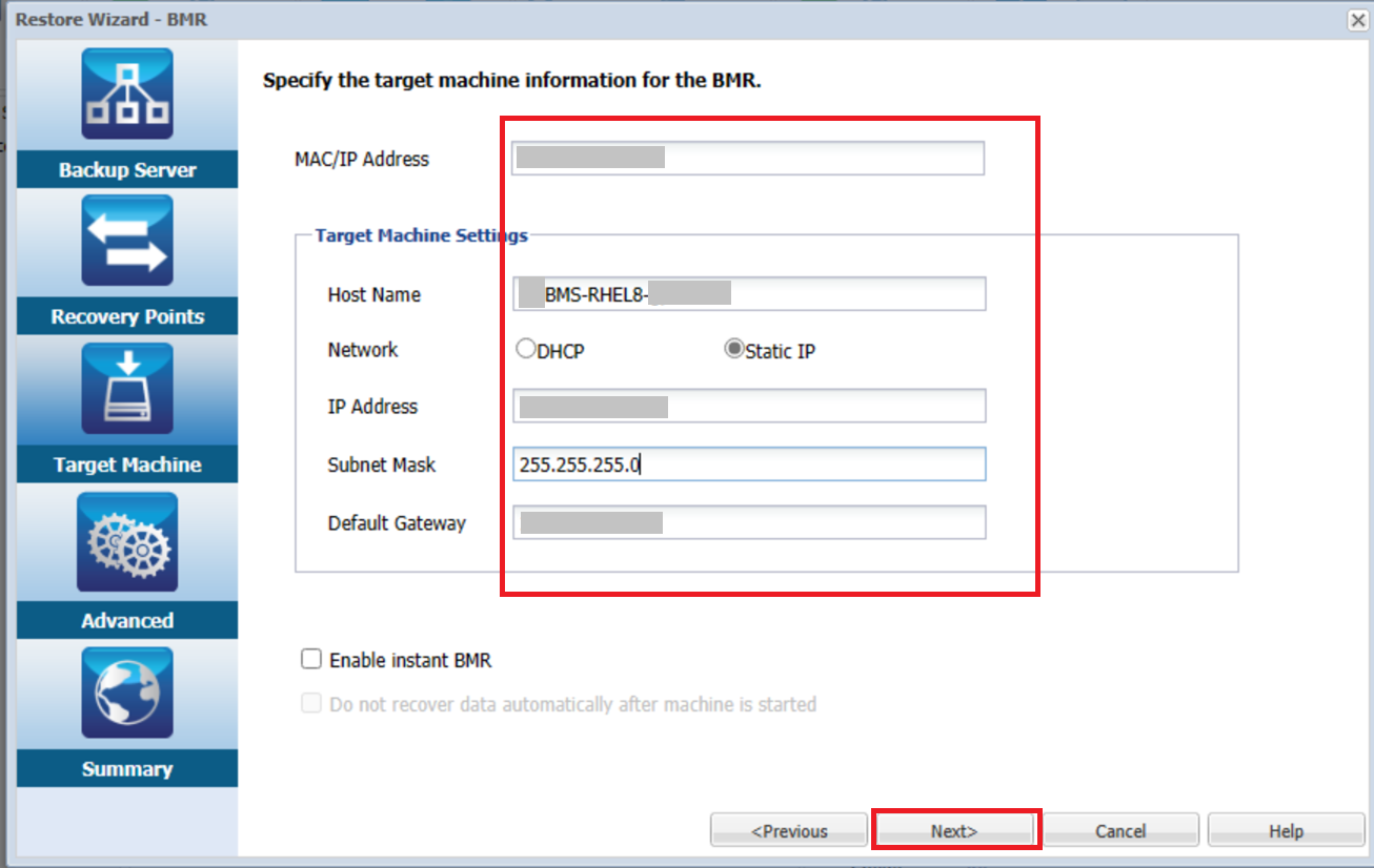MAC/IPアドレス:リストア先ベアメタルサーバー(復旧メディア接続してISOブートしているサーバ)のIPアドレス