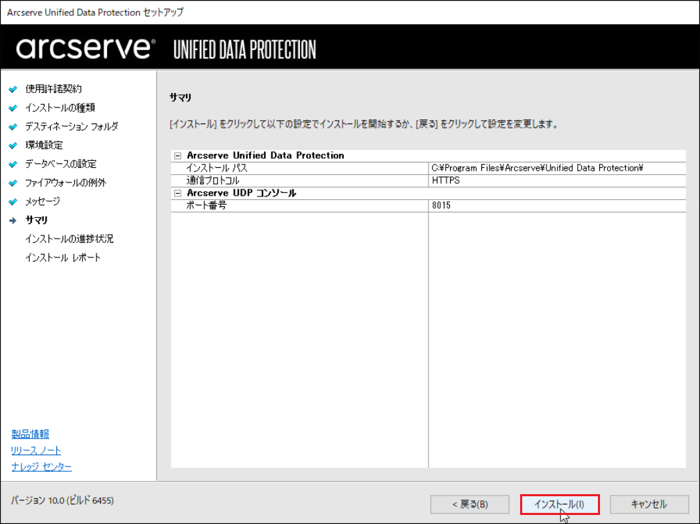 11.サマリー画面が表示されます。[インストール]をクリックします。
