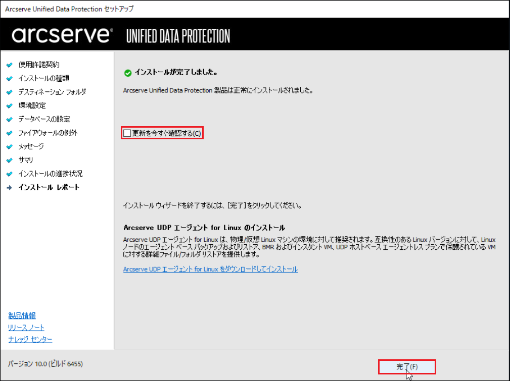 13.[更新を今すぐ確認する]にチェックが入っていない状態で、[完了]をクリックします。