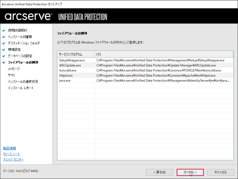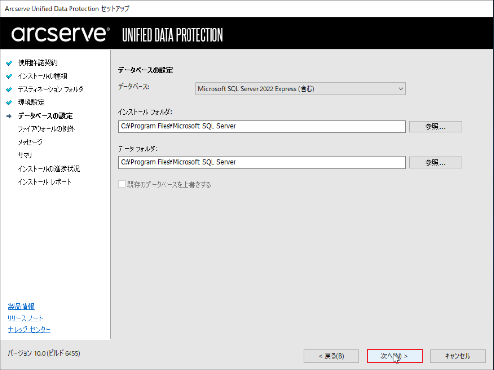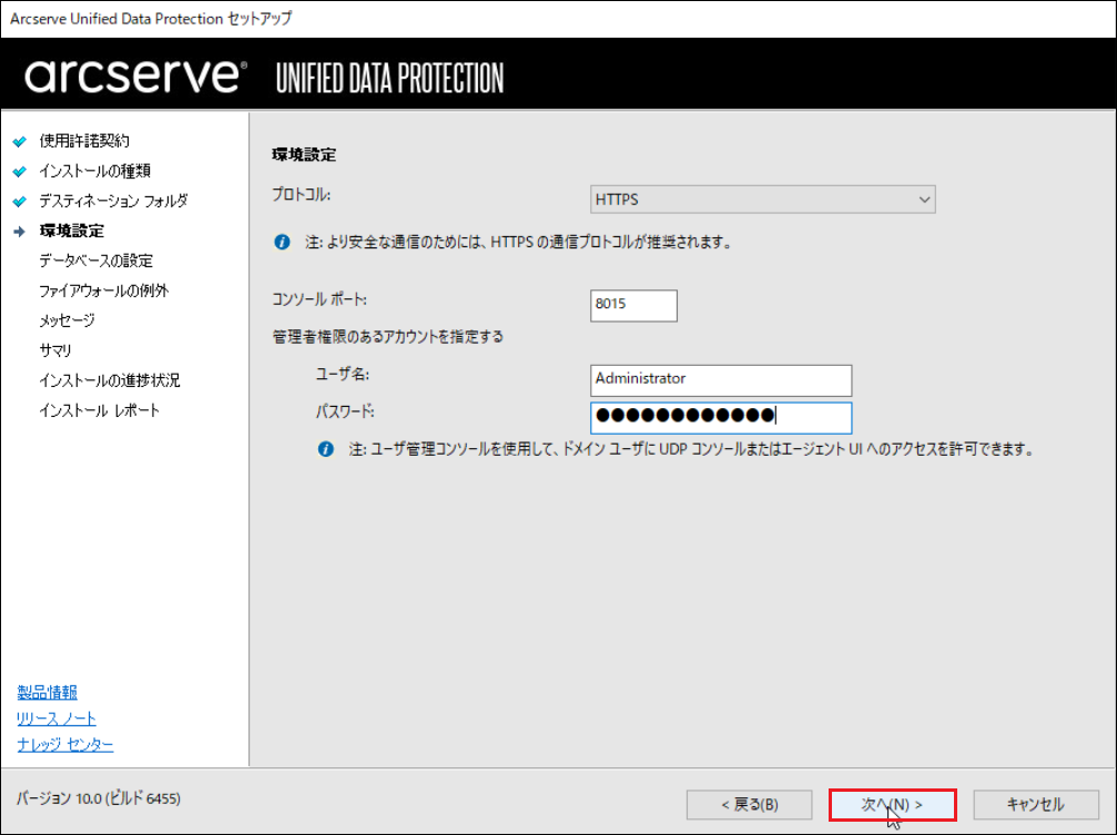 Windowsのインストールで利用可能なポート番号は1024~65535です。指定したポート番号が開いていて利用できることを確認してください。セットアップでは、利用できないポートではインストールできません。ここで登録したポート番号を使用して、Arcserveをリモートのブラウザーからも操作できます。