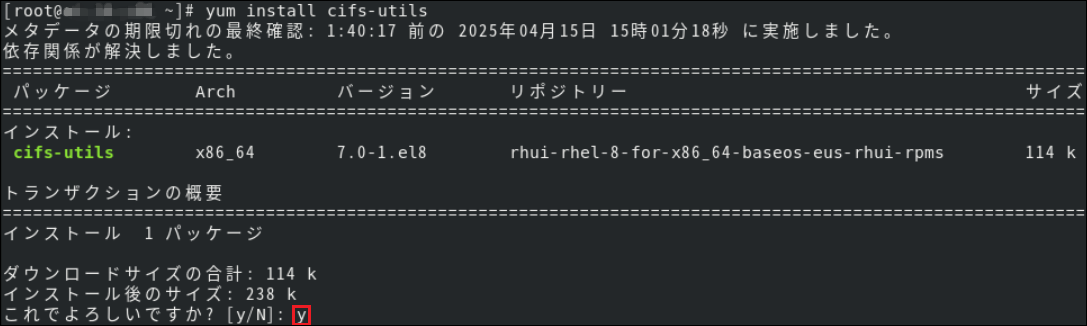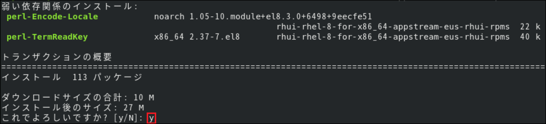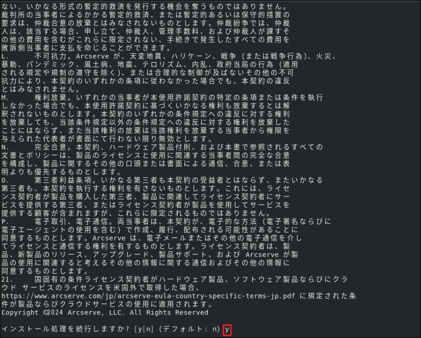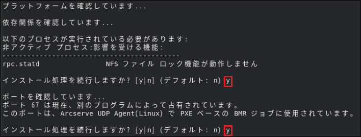 3.[インストール処理を続行しますか?[y|n](デフォルト: n)]では[y]を選択します。
