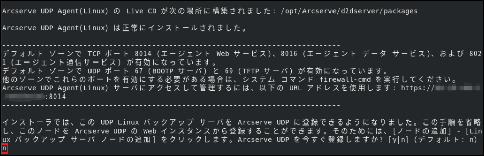 7.[インストーラでは、このUDP LinuxバックアップサーバをArcserveUDPに登録できるようになりました。…]は、[n]を選択します。