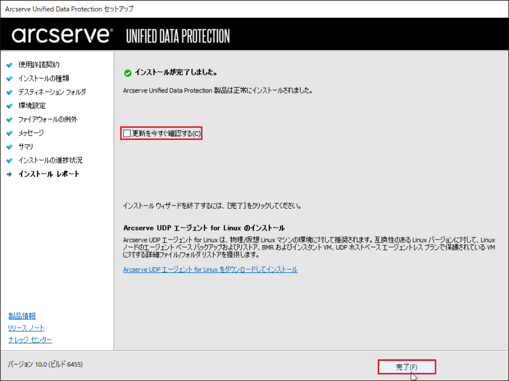 12.[更新を今すぐ確認する]にチェックが入っていない状態で、[完了]をクリックします。