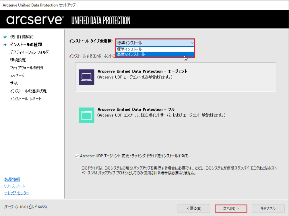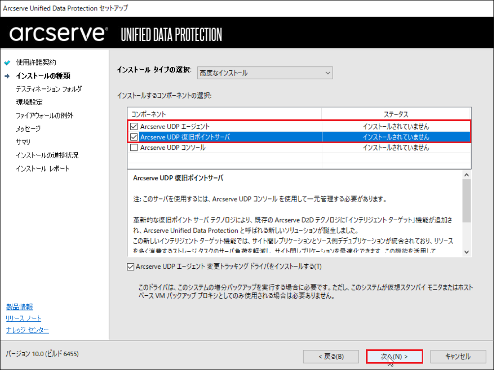 5.[Arcserve UDPエージェント][Arcserve UDP復旧ポイントサーバ]にチェックを入れ、[次へ]をクリックします。