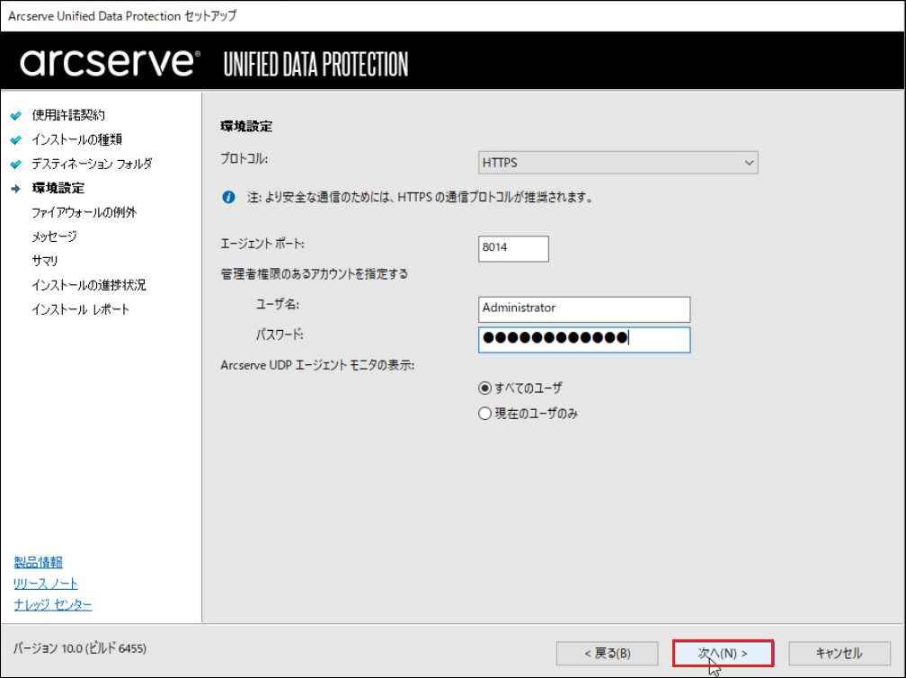 Windowsのインストールで利用可能なポート番号は1024~65535です。指定したポート番号が開いていて利用できることを確認してください。セットアップでは、利用できないポートではインストールできません。ここで登録したポート番号を使用して、Arcserveをリモートのブラウザーからも操作できます。