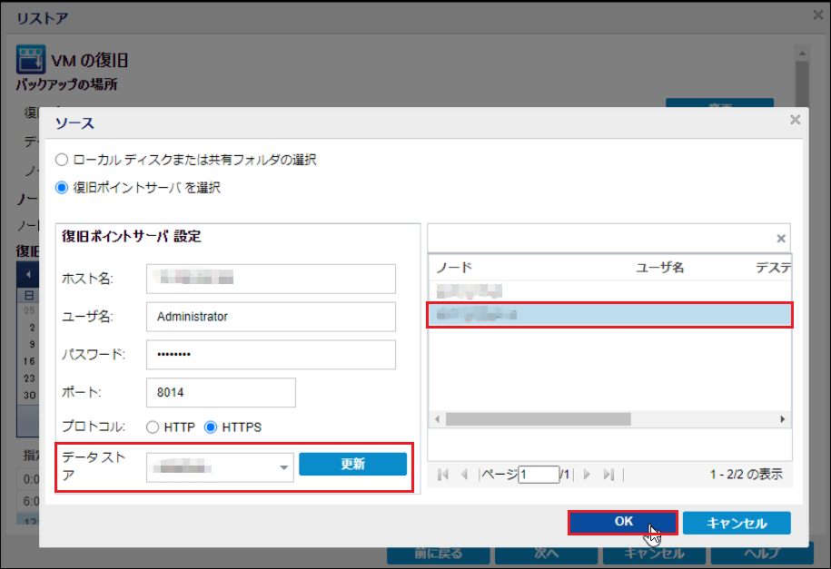 10.「データストア」を選択しますと、「ノード」が表示されるので、リストアする[ノード]を選択し、[OK]をクリックします。