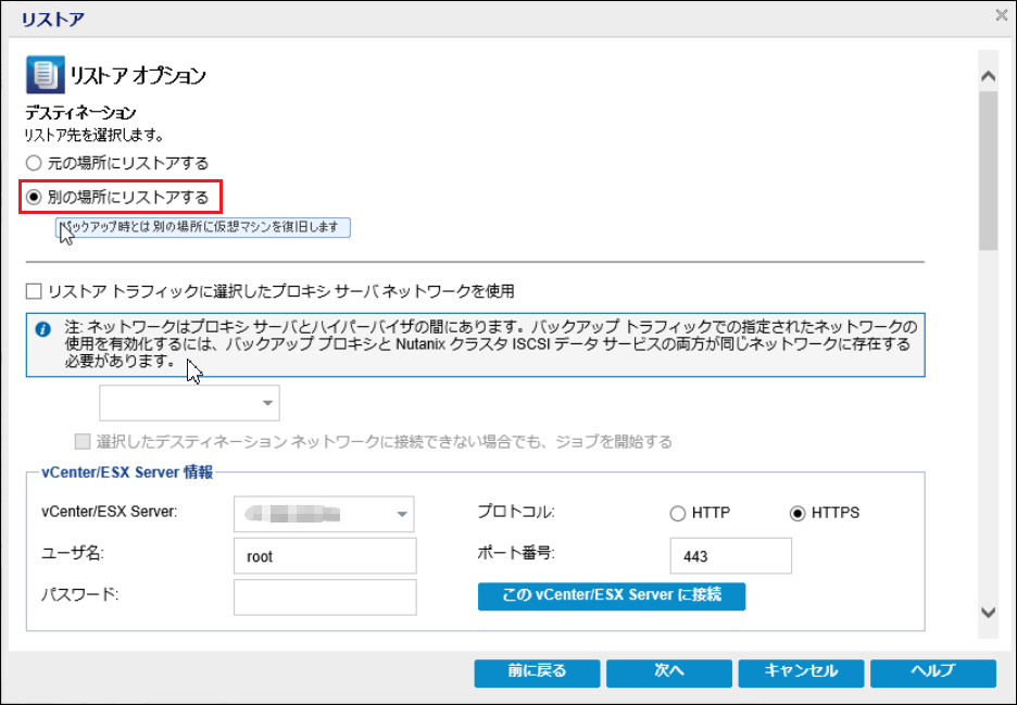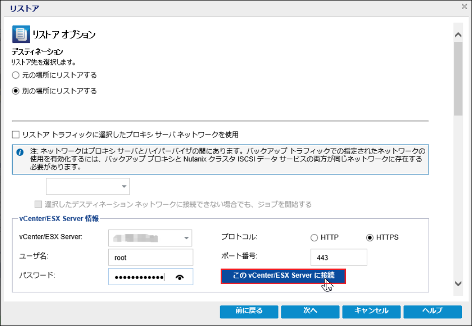 13.「vCenter/ESX Server情報」にてリストア先となるホスト情報を入力し、[この vCenter/ESX Server に接続]をクリックします。