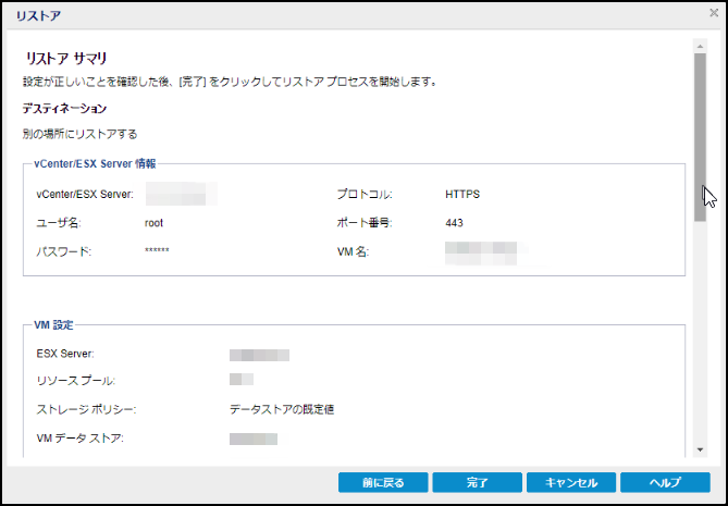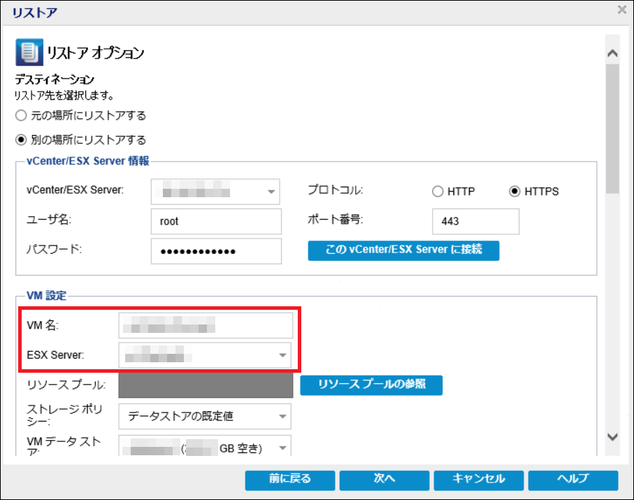 15.「VM設定」でリストア先となる仮想マシン情報を以下のように任意で設定します。