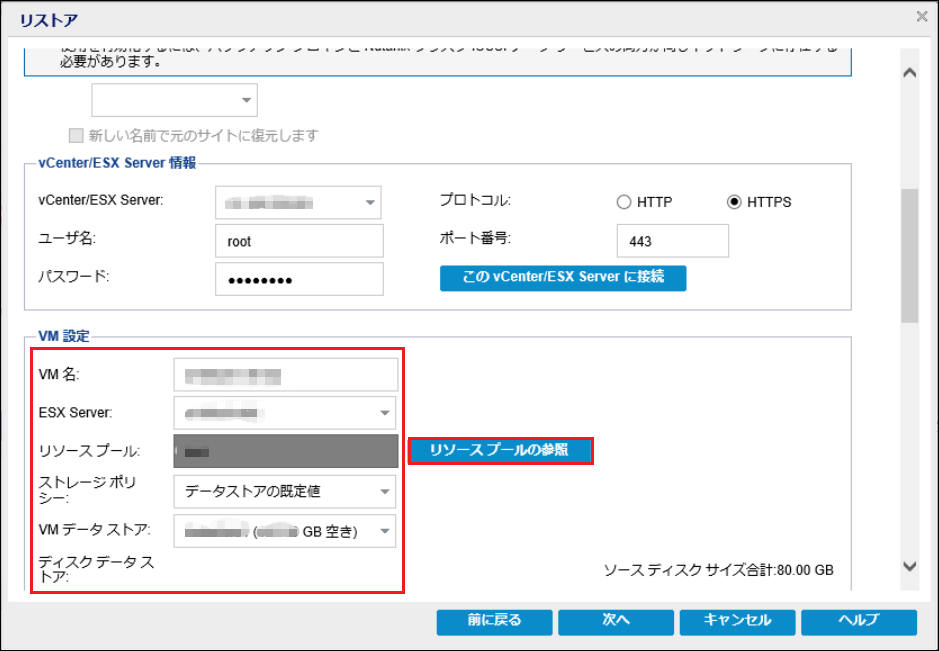 リソースプール:リストア先ホストのリソースプール内にリストアする場合は、[リソースプールの参照]をクリックし対象のリソースプールを選択