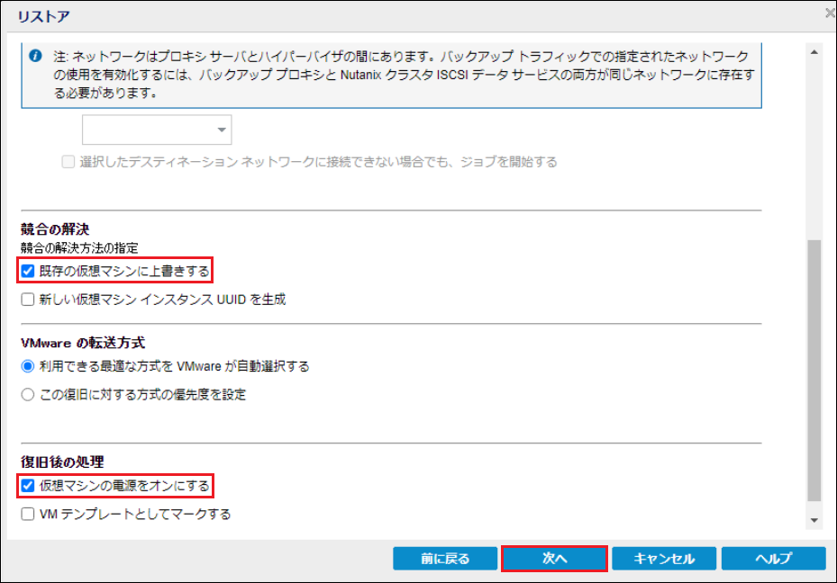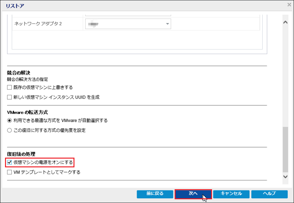 ※[元の場所にリストアする]を選択する場合は、バックアップ元サーバーを削除するか[既存の仮想マシンに上書きする]にチェックを付けてください。