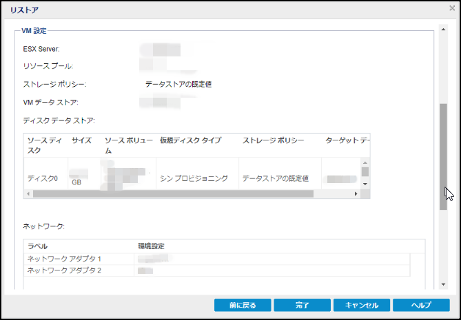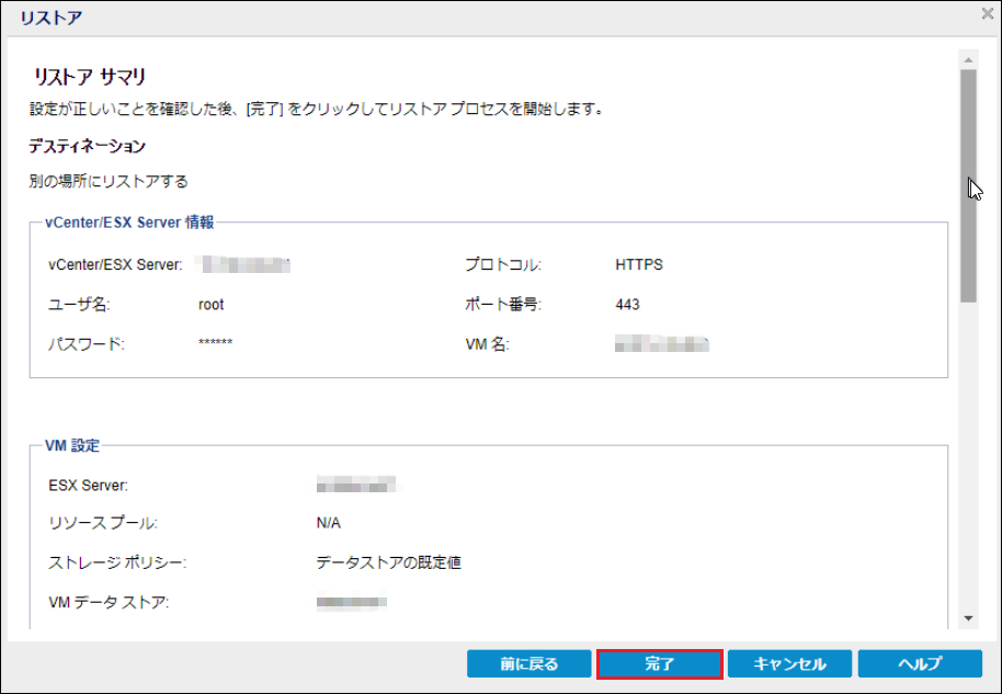 14.「VM設定」の「ESX Server」および「VMデータストア」にホストの情報が表示され、リストア先のホストに接続されたことを確認します。