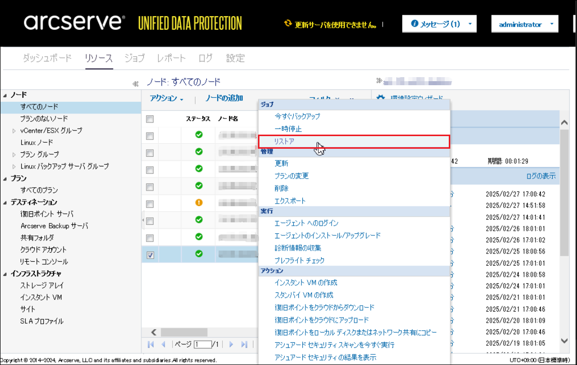 1.Arcserve UDPコンソールの「リソース」画面で、対象ノードを右クリックし[リストア]をクリックします。