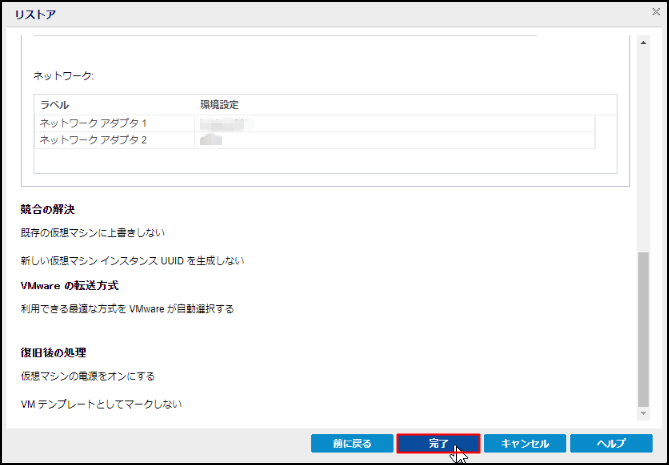 16.設定を確認し、「復旧後の処理」の「仮想マシンの電源をオンにする」にチェックを入れ、[次へ]をクリックします。