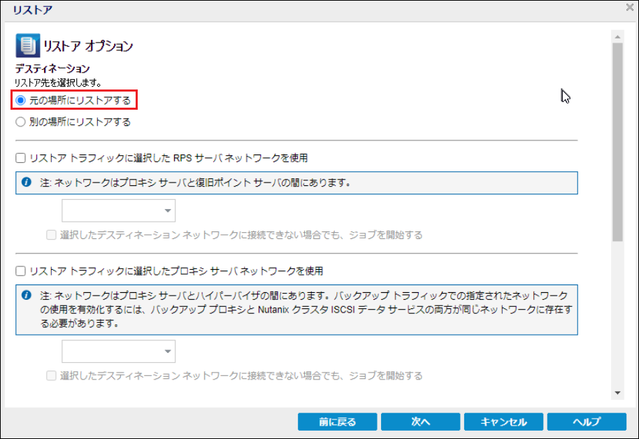 「デスティネーション」は[別の場所にリストアする]を選択します。