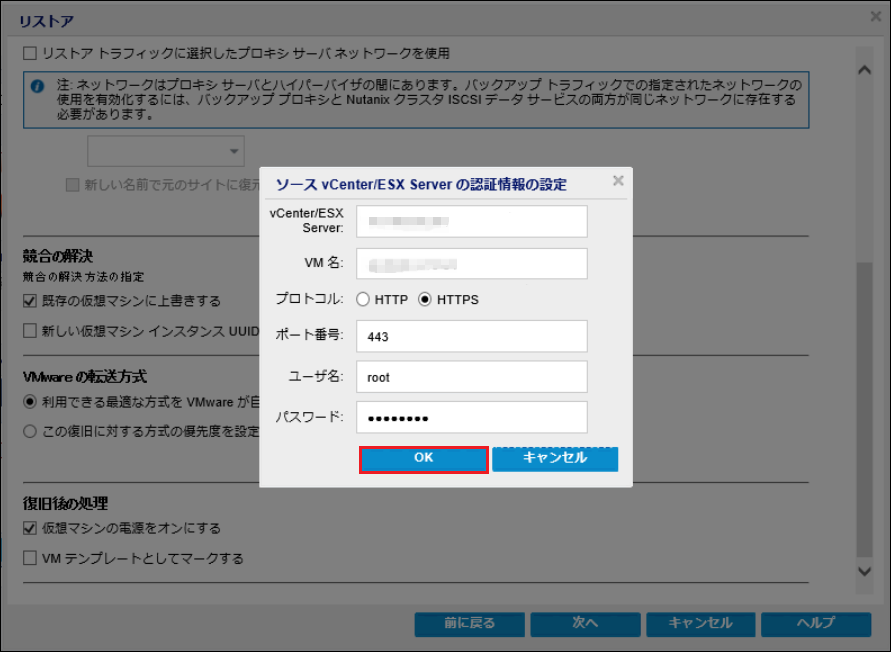 19.「ソースvCenter/ESX Serverの認証情報の設定」画面が表示されるため、必要項目を入力し、[OK]をクリックします。
