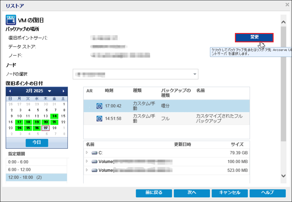 4.復旧したいバックアップを選択し、[変更]をクリックします。