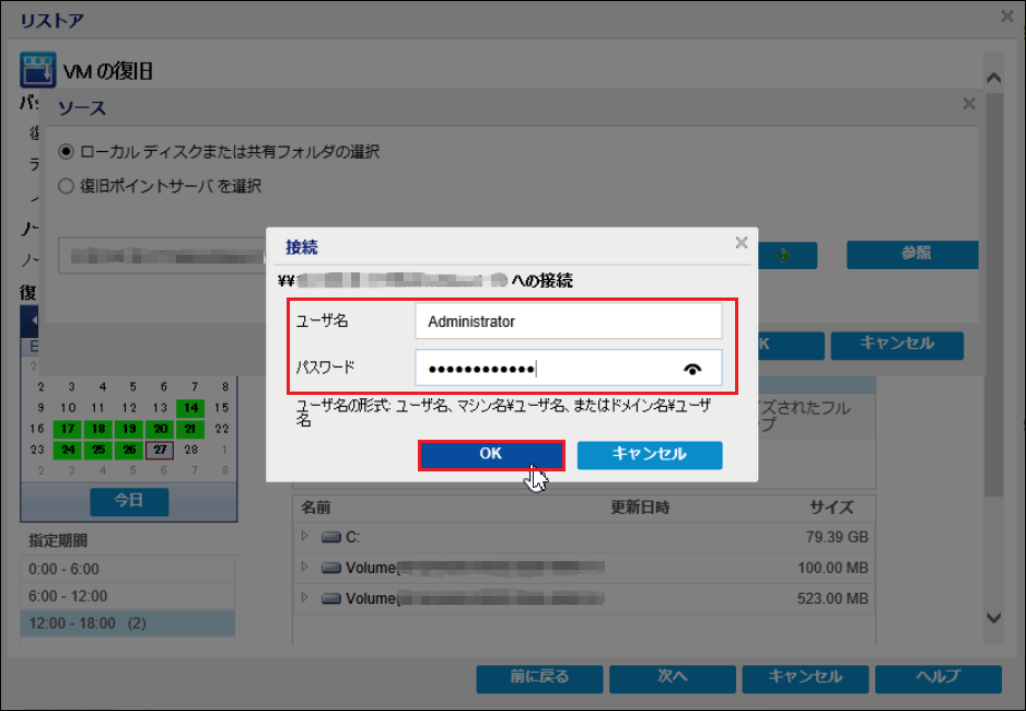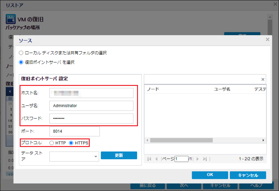 ユーザ名:リストア先となるホストのユーザー名を入力