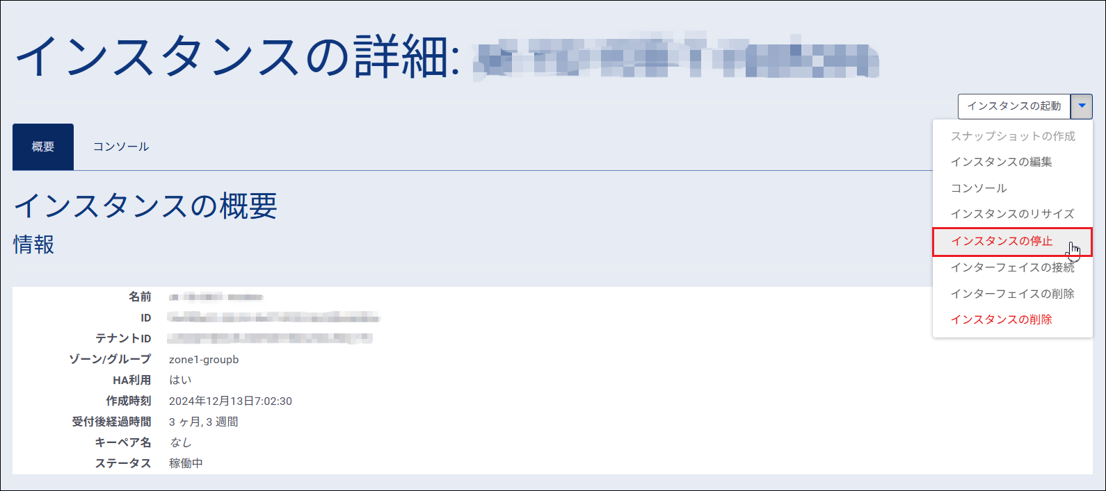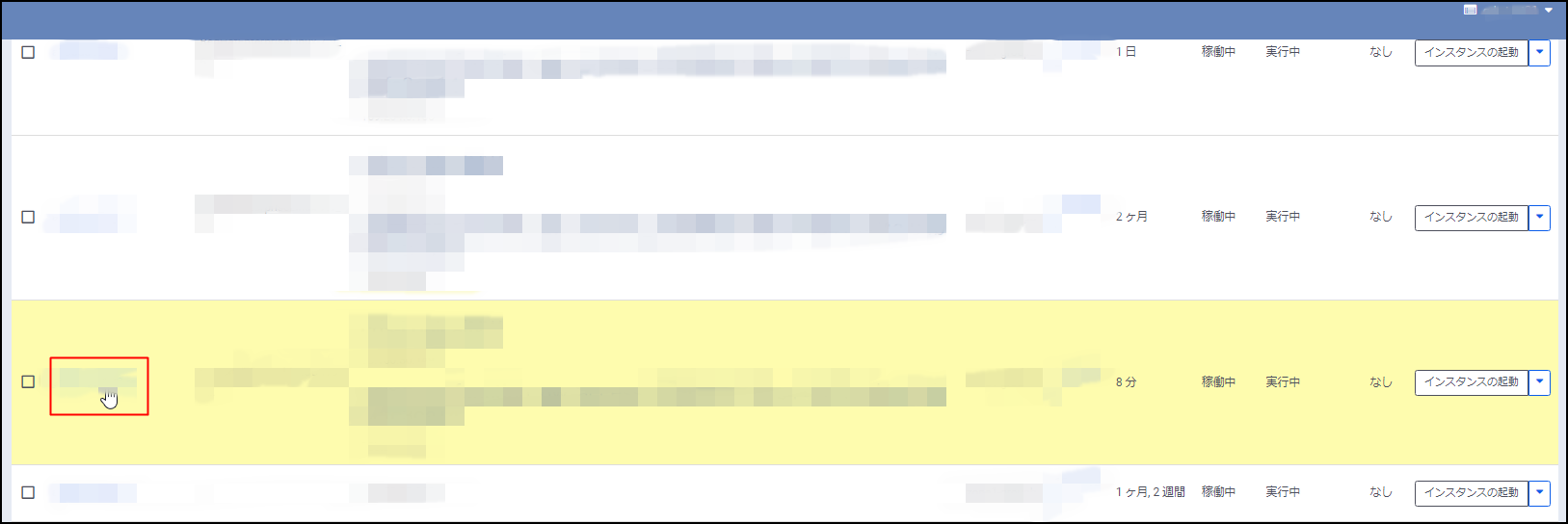 1.リストア用の一時インスタンスを起動し、インスタンス名の項目をクリックして「インスタンス」画面を表示します。