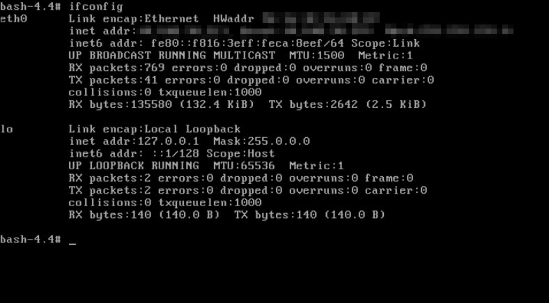 ifconfigコマンドで、IPアドレスが設定されていない状態であることを確認します。
