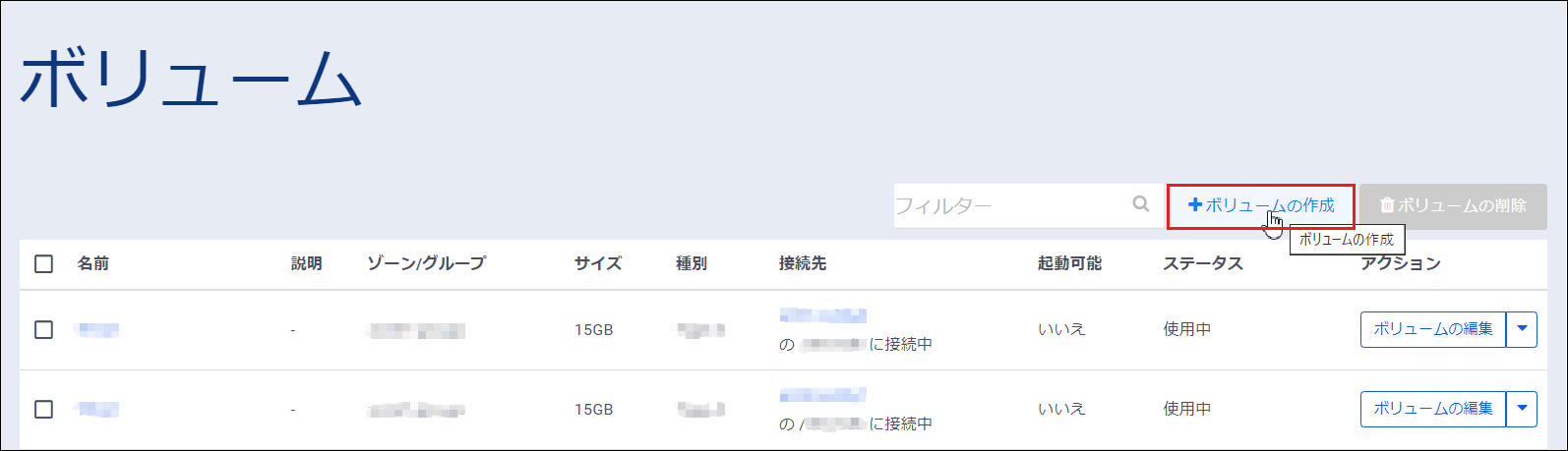 [サーバーインスタンス]—[ボリューム]—[ボリュームの作成]をクリックします。