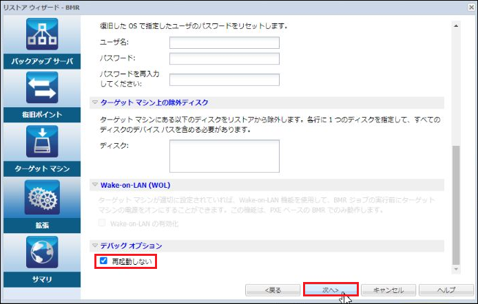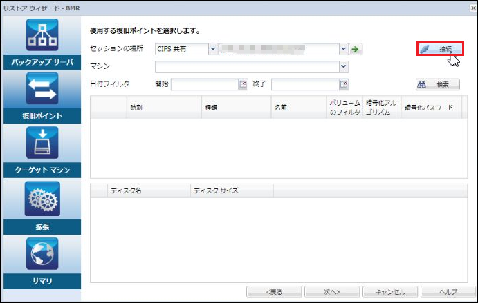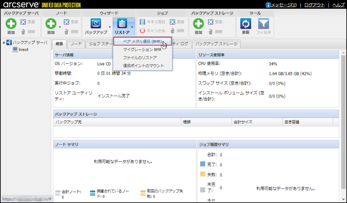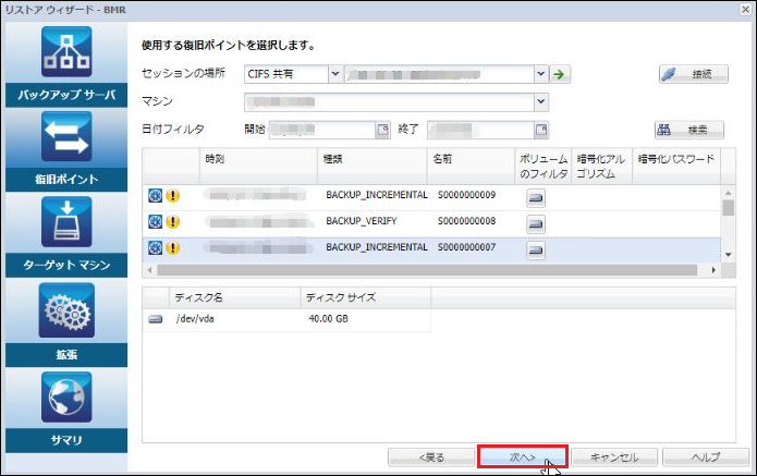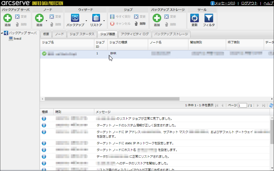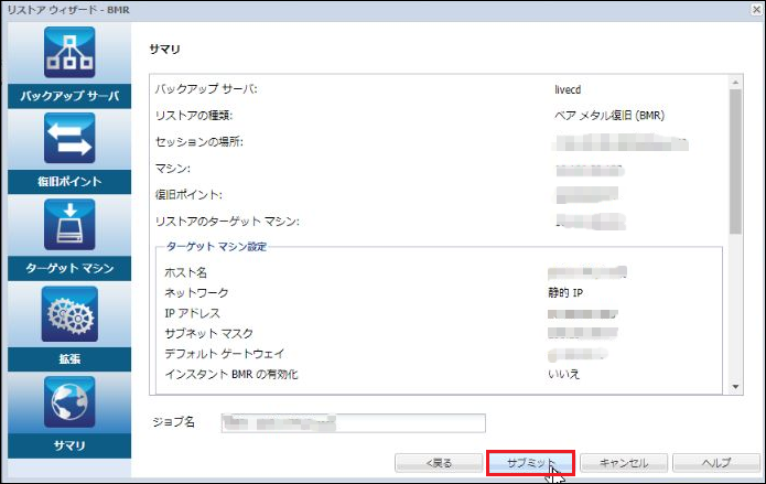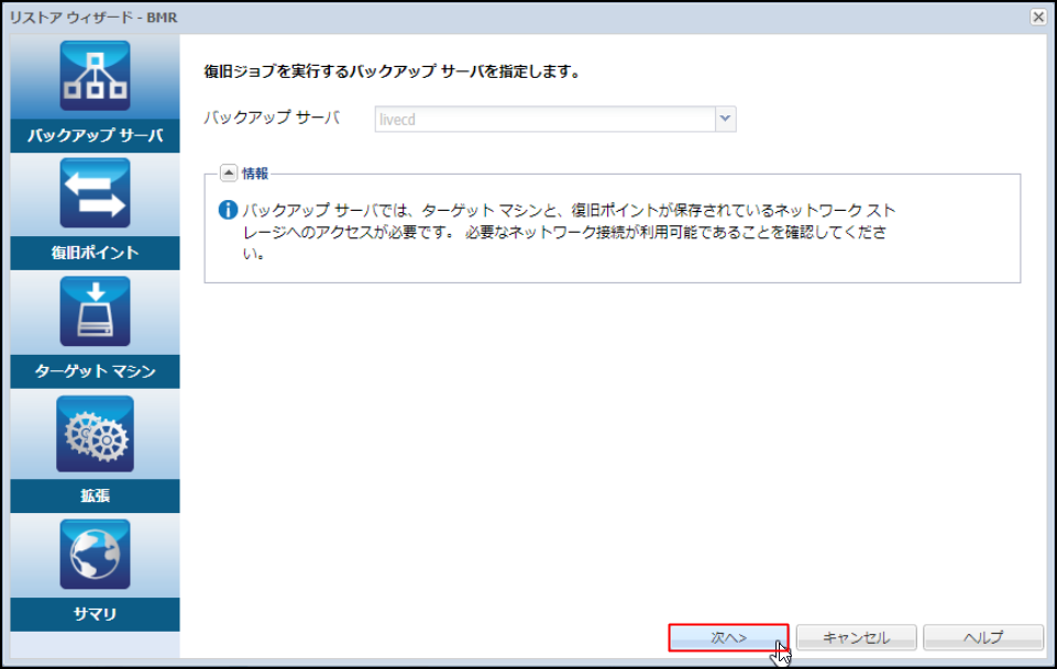 リストアジョブ実行中に「サーバに接続できませんでした」というエラーが出てリストアジョブの成功ログを確認できない場合がありますが、以後の手順でOSが正常に起動する場合はリストアは成功しているため、問題ございません。