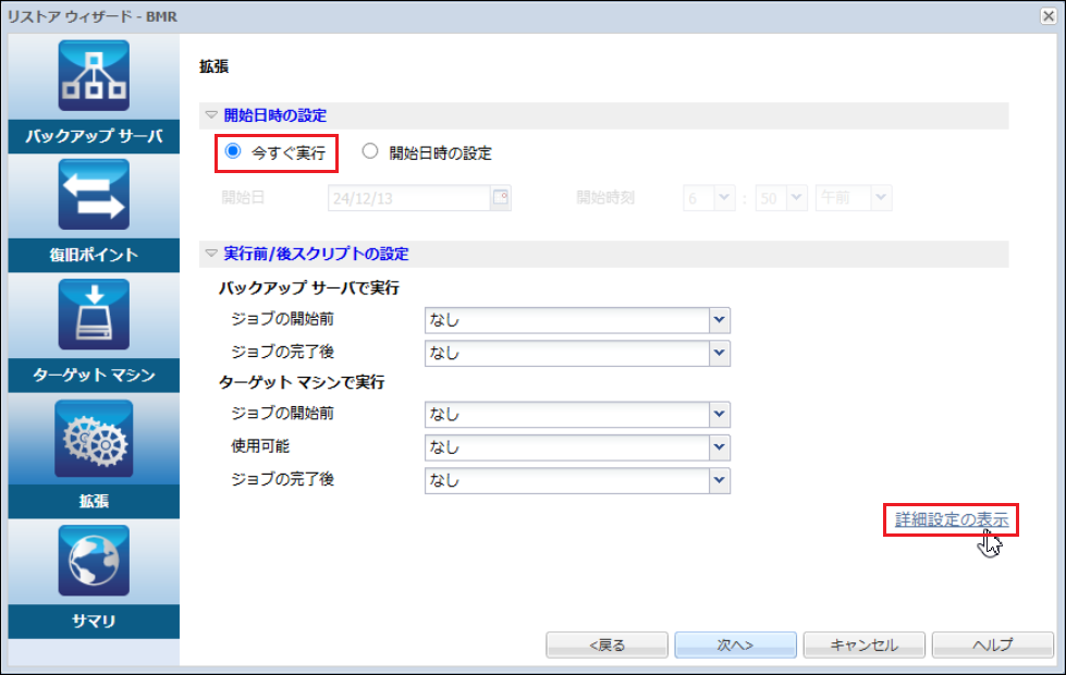 19.開始日時の設定にて、[今すぐ実行]を選択し、[詳細設定の表示]をクリックします。