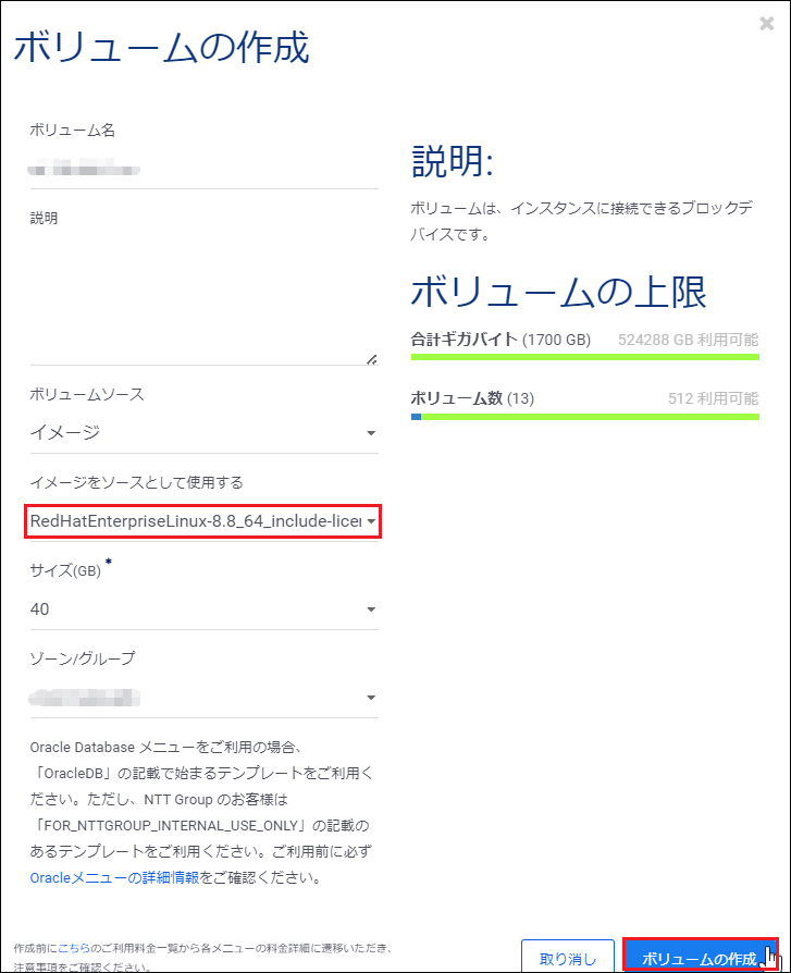 3.以下を入力/選択しボリュームの作成をクリックします。