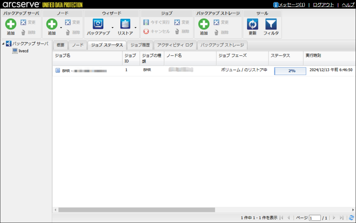22.元の画面に戻り、[ジョブステータス]タブにてリストアジョブが実行されたことを確認します。