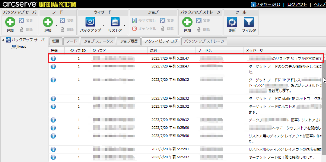 24.[アクティビティログ]タブにてリストアジョブが成功したことを確認します。