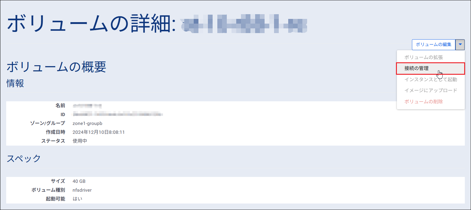 2.作成したボリューム(上記のArcserveでリストアしたボリューム)の[ボリュームの編集]欄の[▼]をクリックして、[接続の管理]を選択します。