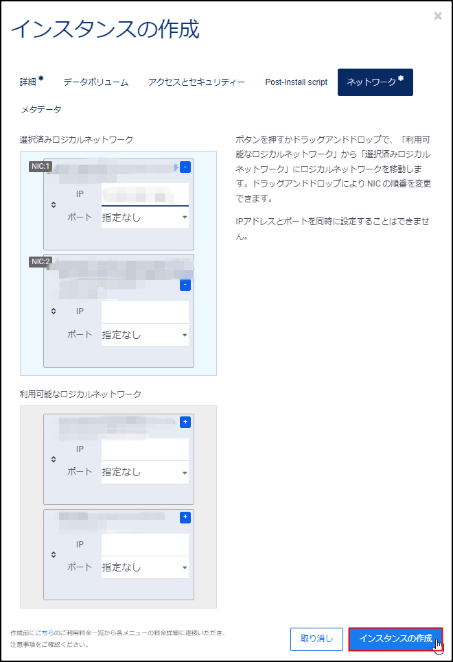 選択済みロジカルネットワークにIPアドレスを設定します。設定後、[インスタンスの作成]をクリックします。
