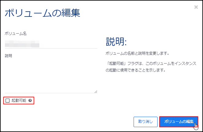 6.[起動可能]のチェックを外し、[ボリュームの編集]をクリックします。