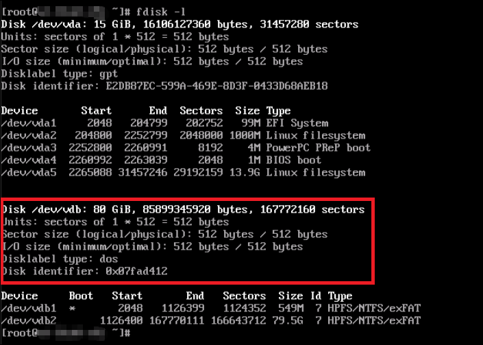 8.コンソール画面で、「fdisk -l」を実行し、接続されているボリュームの確認をします。
