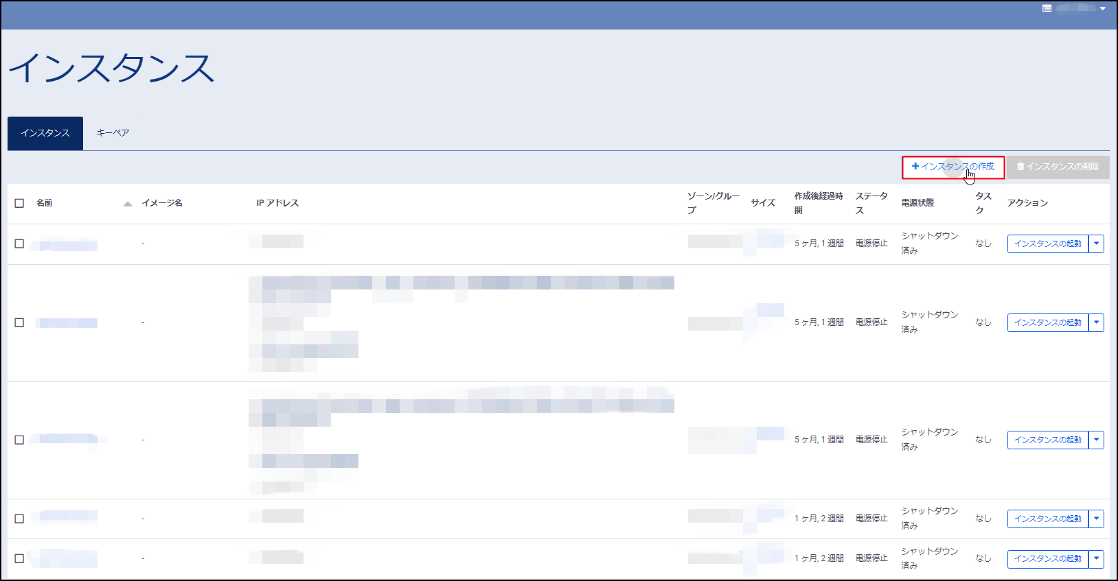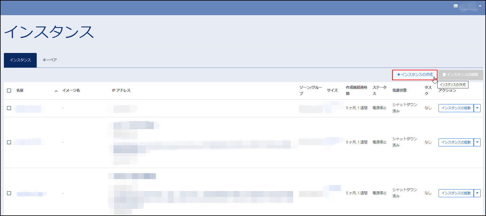 6.次に新規にインスタンス(リストアサーバー)を作成します。[インスタンスの作成]をクリックします。