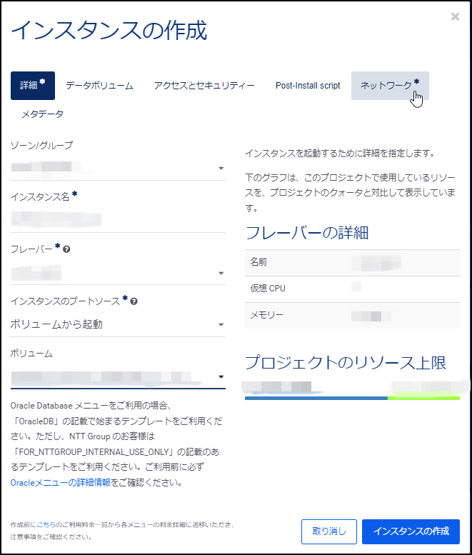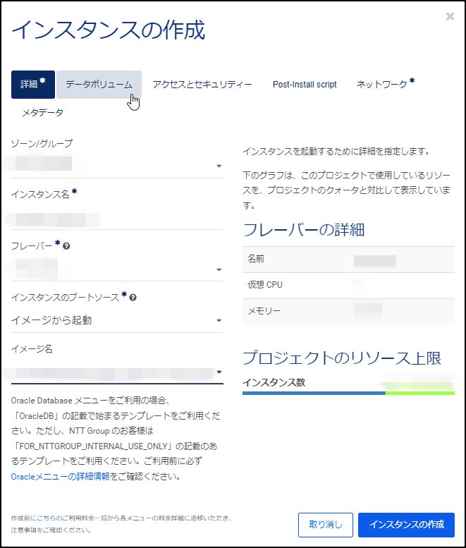 2.「インスタンスの作成」画面が表示されるので、各タブにて項目を設定します。