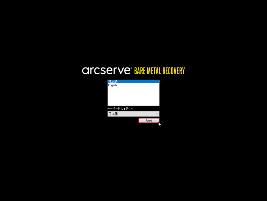 3.インスタンスの画面を表示すると、以下のように自動でArcserveの「BARE METAL RECOVERY」画面が表示されます。
