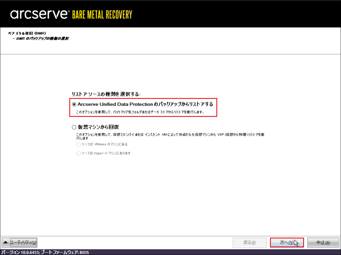 4.「リストアソースの種類を選択する」画面にて、[Arcserve Unified Data Protection のバックアップからリストアする]が選択されていることを確認し、[次へ]をクリックします。