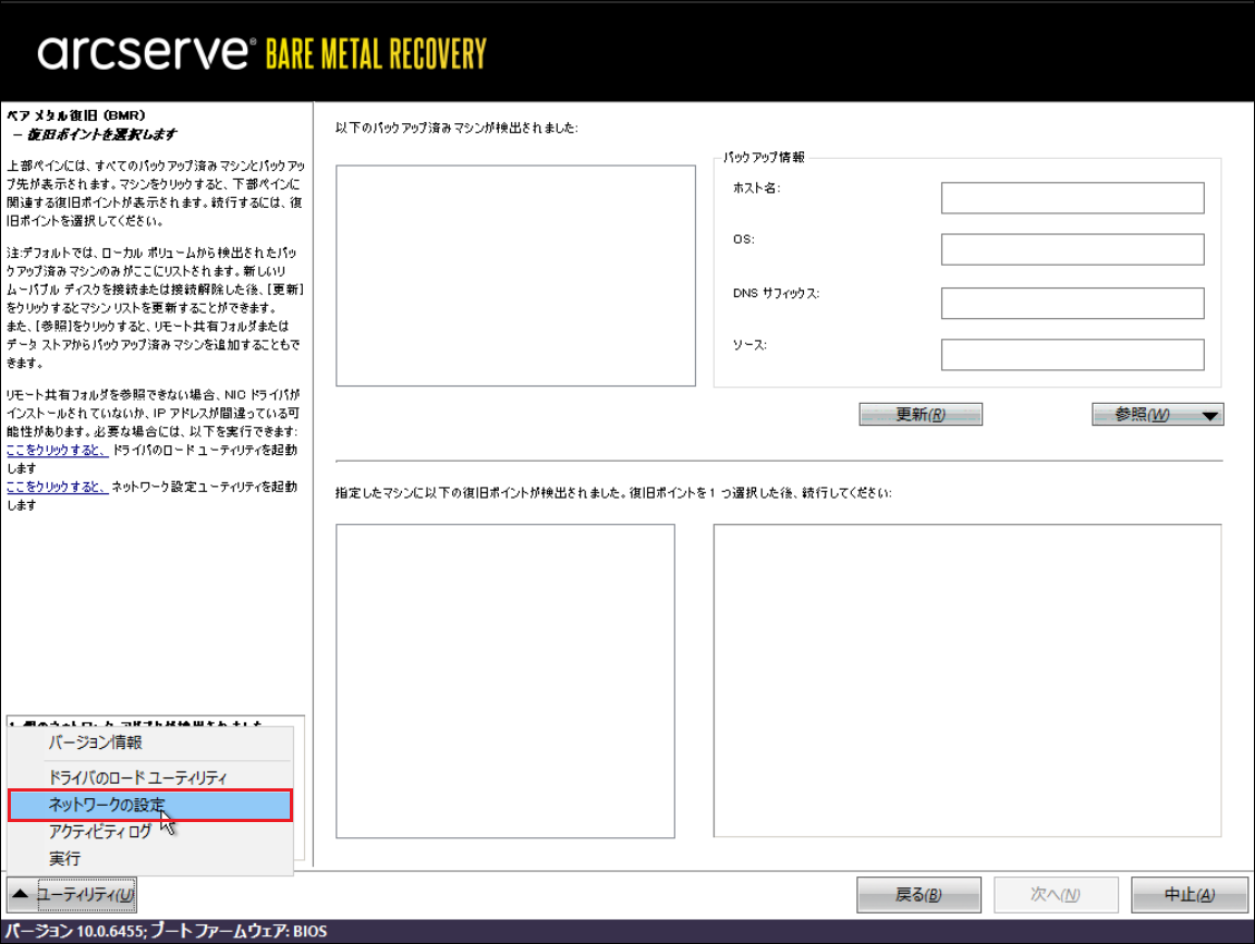 5.次の画面にて、ネットワークの設定を行います。画面左下の[ユーティリティ]をクリックし、[ネットワークの設定]をクリックします。