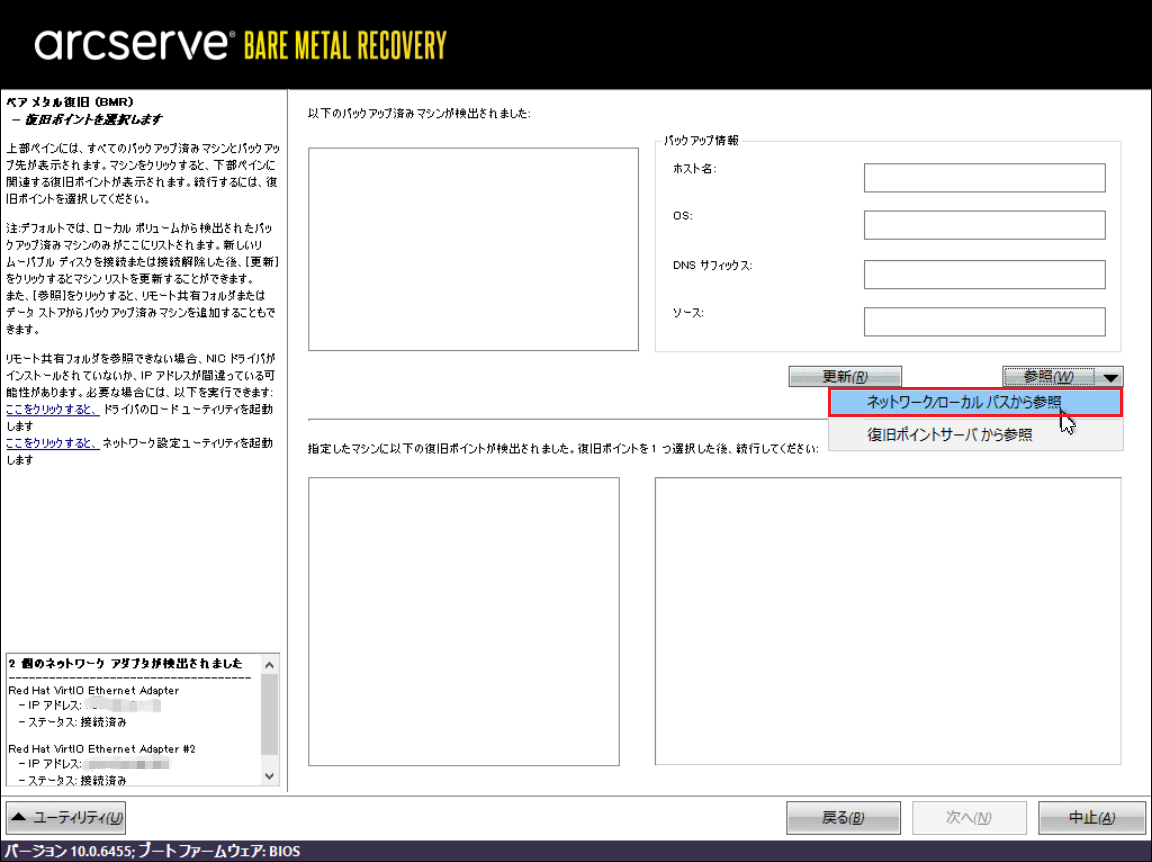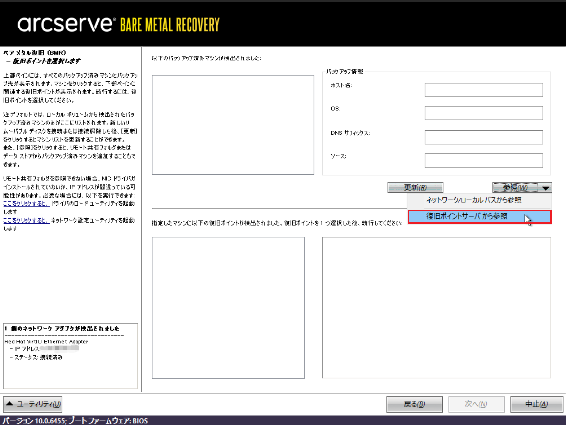 12.「復旧ポイントサーバー」にバックアップを保存した場合、下記画面の[参照]から[復旧ポイントサーバから参照]をクリックします。