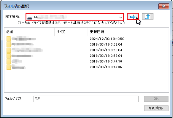 8.リストアファイル(バックアップされたファイル)を保存している場所を「¥¥」(半角)で始まるUNCパスで直接「探す場所」に入力し[→]をクリックします。